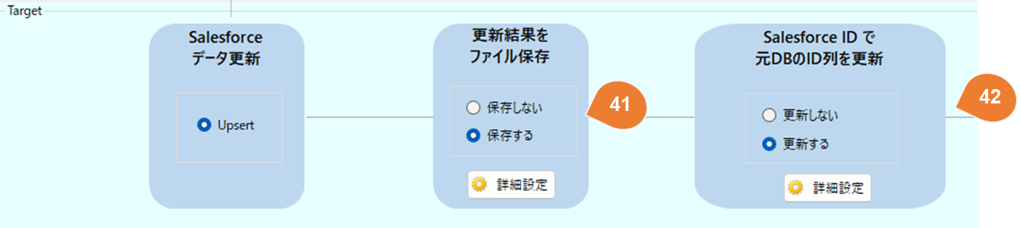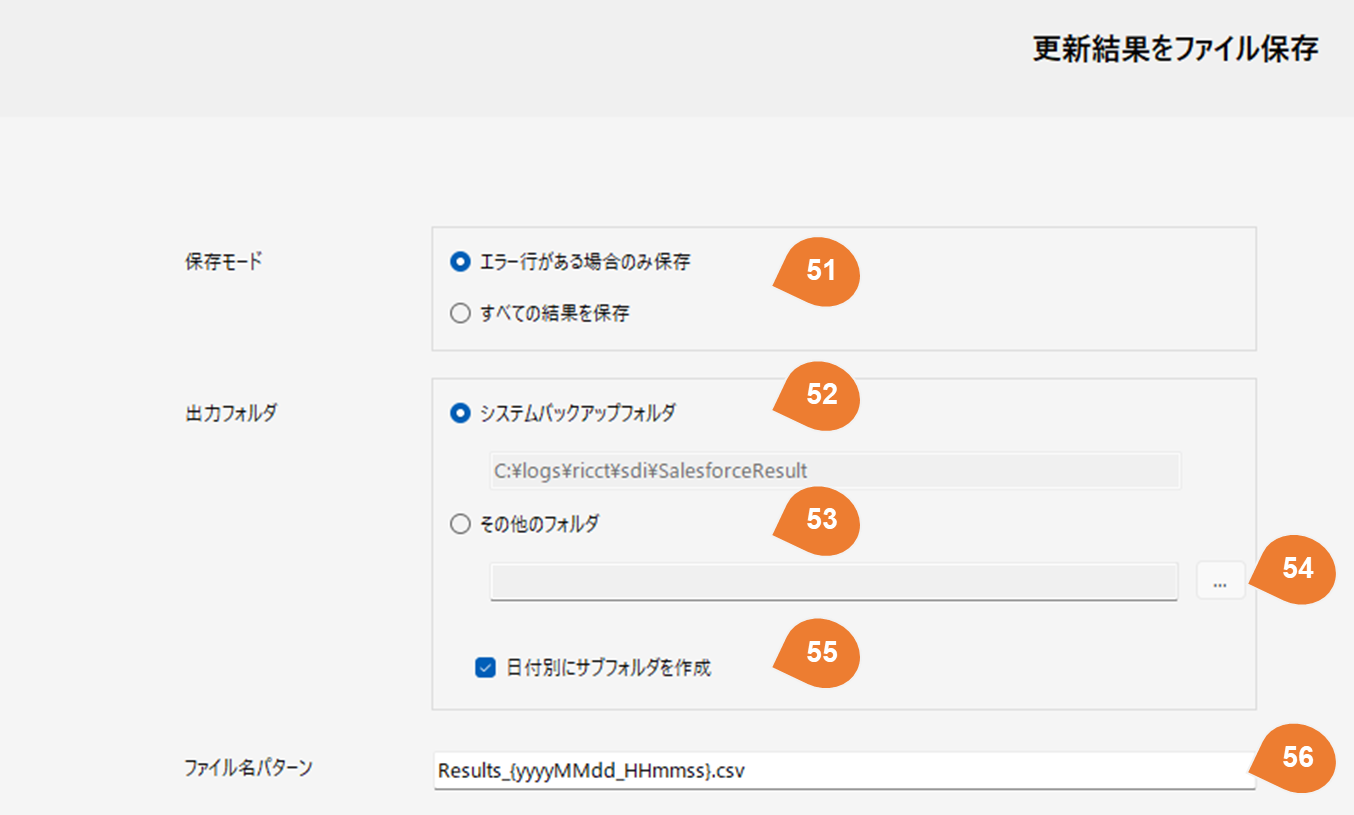 | 41 | 更新結果をファイル保存 | Salesforce への更新(Upsert 等)を実行した結果(成功/失敗、エラー内容、Salesforce ID など)を 結果ファイルとして保存するかを選択します。保存しない:結果ファイルを出力しません。保存する:更新結果をファイルに出力します。必要に応じて[詳細設定]で出力先・ファイル名・出力内容などを設定します。 |