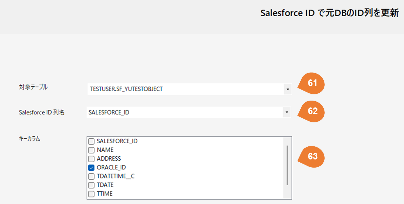 | 63 | キーカラム | 元DB側で、どの行を更新するかを特定するためのキー列(照合キー)を選択します。 更新結果(元データ)と元DBの行を突合し、該当行の Salesforce ID 列(No.62)を更新します。 ※通常は、元データ側で一意になる列(例:ORACLE_ID など)を選択してください。 |