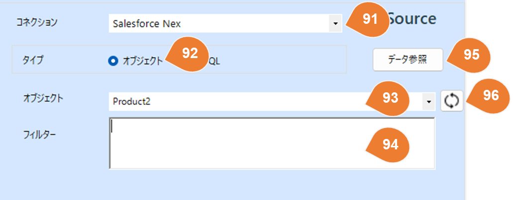 | 92 | タイプ | Salesforceコネクションを選択した場合、ソースタイプとしてオブジェクトまたはSOQLを選択できます。 |