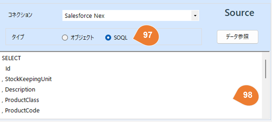 | 97 | SOQL | ソースデータの取得方法としてSOQLを使用したい場合、SOQLを選択してください。 |